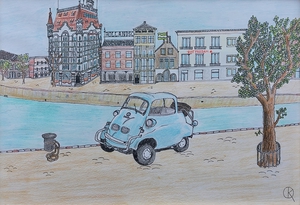 2023Dit is een tekening van een lichtblauwe BMW Insetta die geparkeerd staat in de oude haven van Rotterdam.