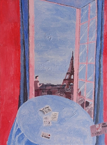 2023Dit is het tweede schilderij uit mijn serie van drie schilderijen over de levensloop van de Japanse kunstenaar On Kawara. Alle drie de schilderijen zijn alleen gemaakt met de kleuren rood, blauw, zwart en wit, want dit waren ook de enige kleuren die On Kawara in zijn werk gebruikte. On Kawara was in zijn leven veel op reis en tijdens deze reizen stuurde hij telegrammen naar zijn vrienden en familie. Deze telegrammen waren erg merkwaardig en daarom zijn deze tegenwoordig te zien in meerdere musea in de wereld. Zo stuurde hij een paar keer een telegram met de tekst "I Went". Er was dan bij dit telegram een kaart gevoegd waarop On Kawara met een rode lijn exact had aangegeven hoe hij die dag was gelopen. Ook in dit schilderij zijn een paar van deze telegrammen afgebeeld. Verder is te zien dat On Kawara (op het balkon) zich bevindt in Parijs, de stad waar hij graag naartoe ging.
