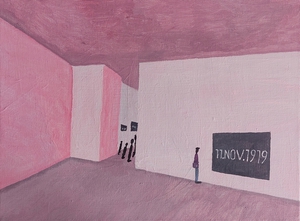 2023Dit is het derde schilderij uit mijn serie van drie schilderijen over de levensloop van de Japanse kunstenaar On Kawara. Alle drie de schilderijen zijn alleen gemaakt met de kleuren rood, blauw, zwart en wit, want dit waren ook de enige kleuren die On Kawara in zijn werk gebruikte. On Kawara staat bekend om zijn date-paintings, schilderijen van data. In dit schilderij is On Kawara afgebeeld in een museum waar zijn werk hangt. Dit schilderij gaat vooral over het mysterieuze karakter van On Kawara. Zo wilde hij nooit interviews afleggen en er zijn maar weinig foto's van hem te vinden. Ook in dit schilderij zie je On Kawara alleen in de zaal staan voor een van zijn eigen schilderijen. Ook is de andere zaal in de achtergrond te zien. In die zaal staan veel meer mensen schilderijen te bewonderen. Dit schilderij laat zien dat On Kawara niet in de spotlight wil staan en dus ook niet tussen de andere mensen die zijn werk bekijken gaat staan.